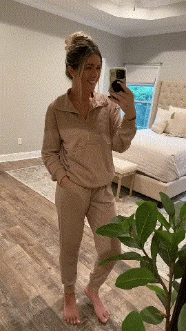 This fall sweatshirt is very soft and skin-friendly, with practical front pockets for storage and a half-zip design that allows the zipper to be freely adjusted according to the temperature. The women's jogging pants with elastic waistband and drawstring ensure all-day comfort!