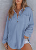 This waffle knit top is made from a solid color material, providing a simple yet elegant look. The button-up design adds a unique touch to this versatile piece. The boyfriend-style design of this lady's tunic ensures a loose and comfortable fit.
