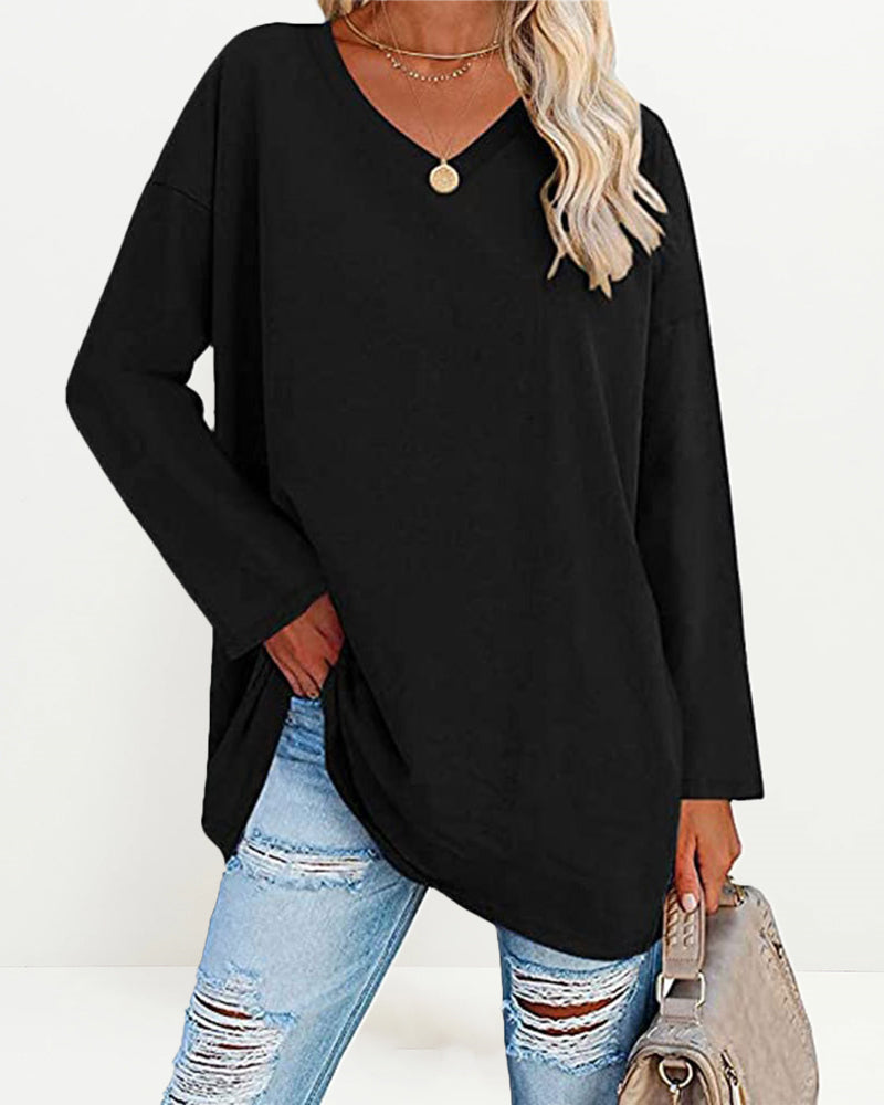 Solid Color V Neck Long Sleeve Pullover Basic Tshirts Casual Sweatshirts