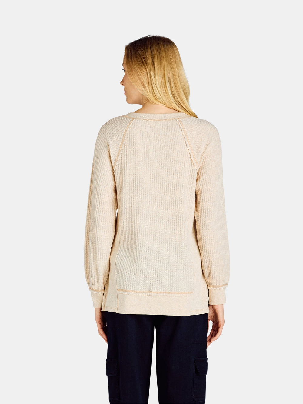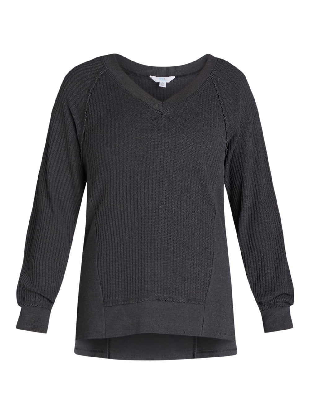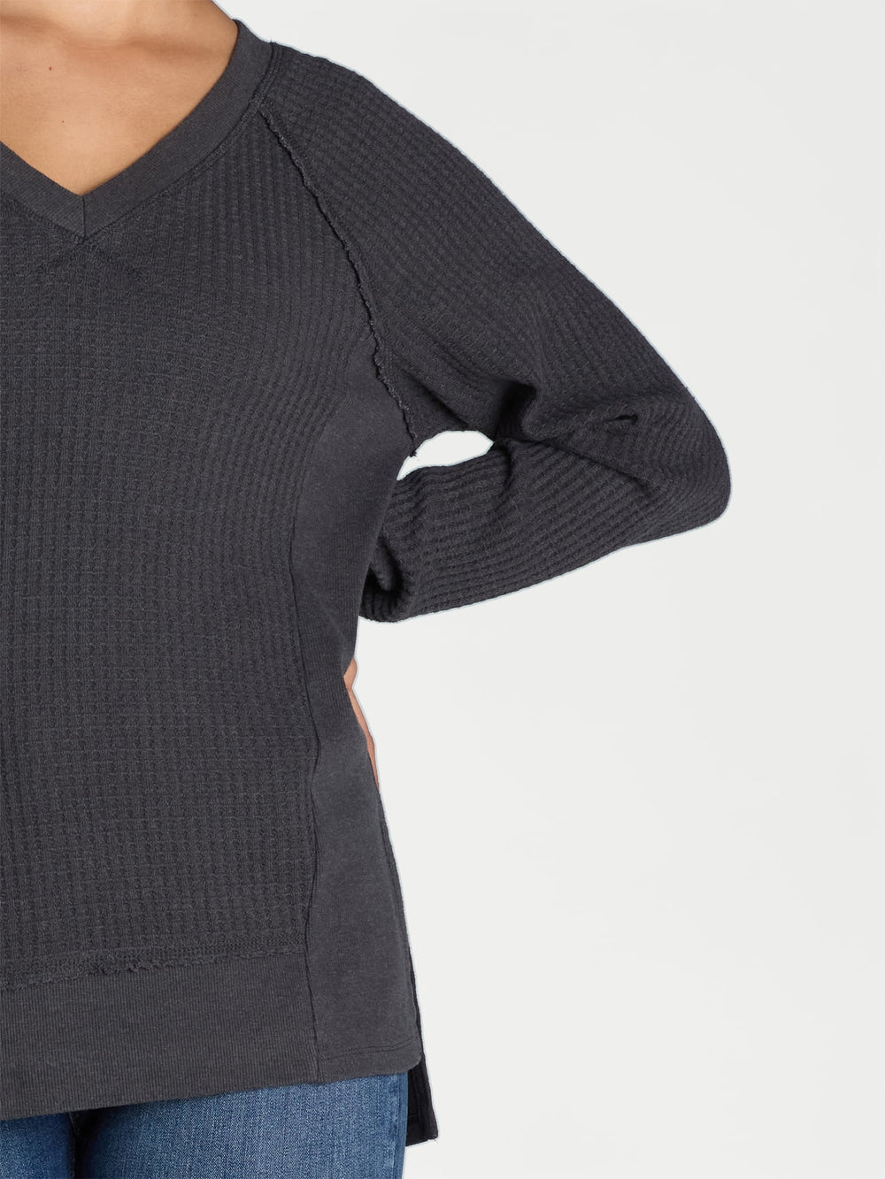 - Features: Waffle knit; rib-knit insets at sides; side slits; subtle distressed edges