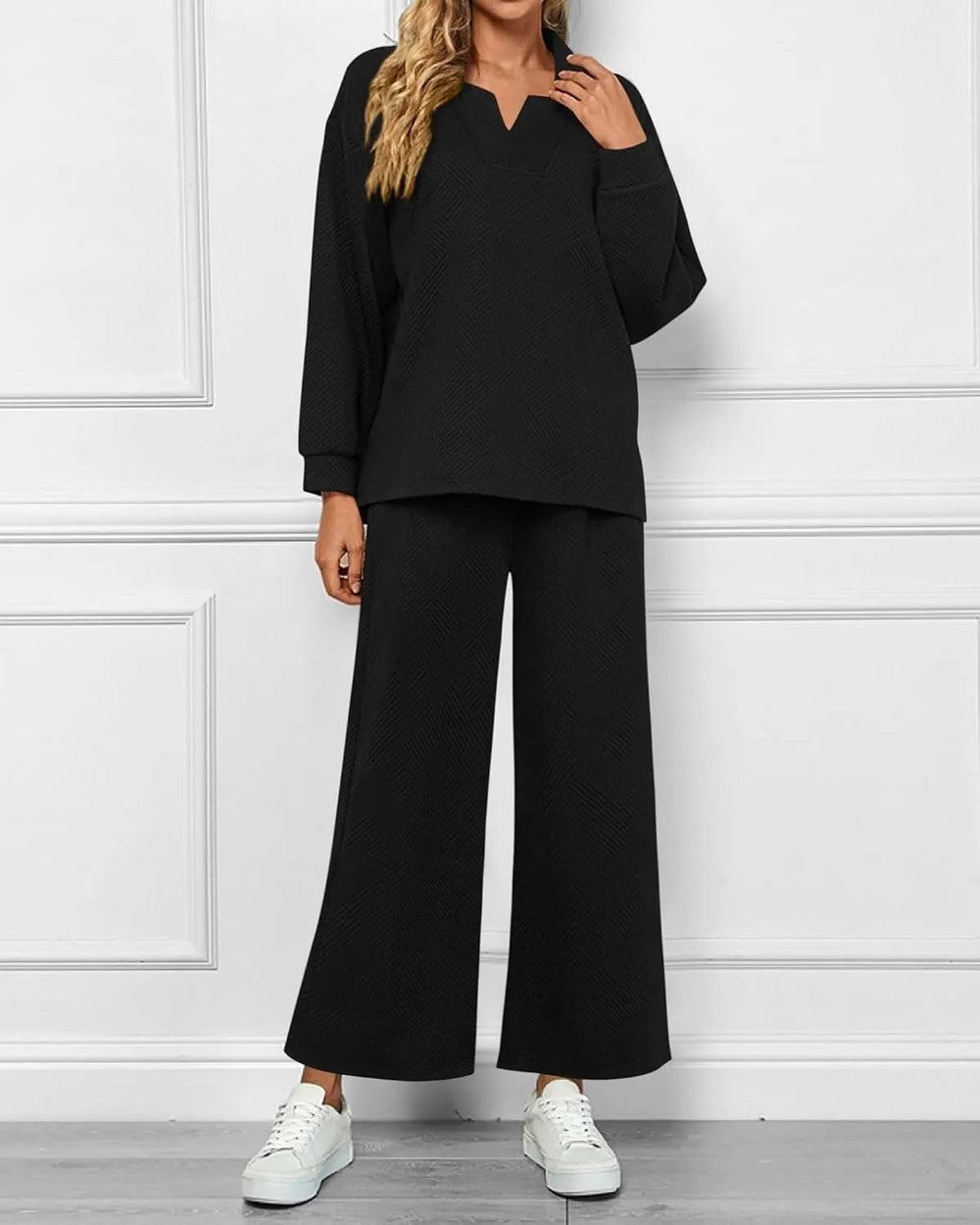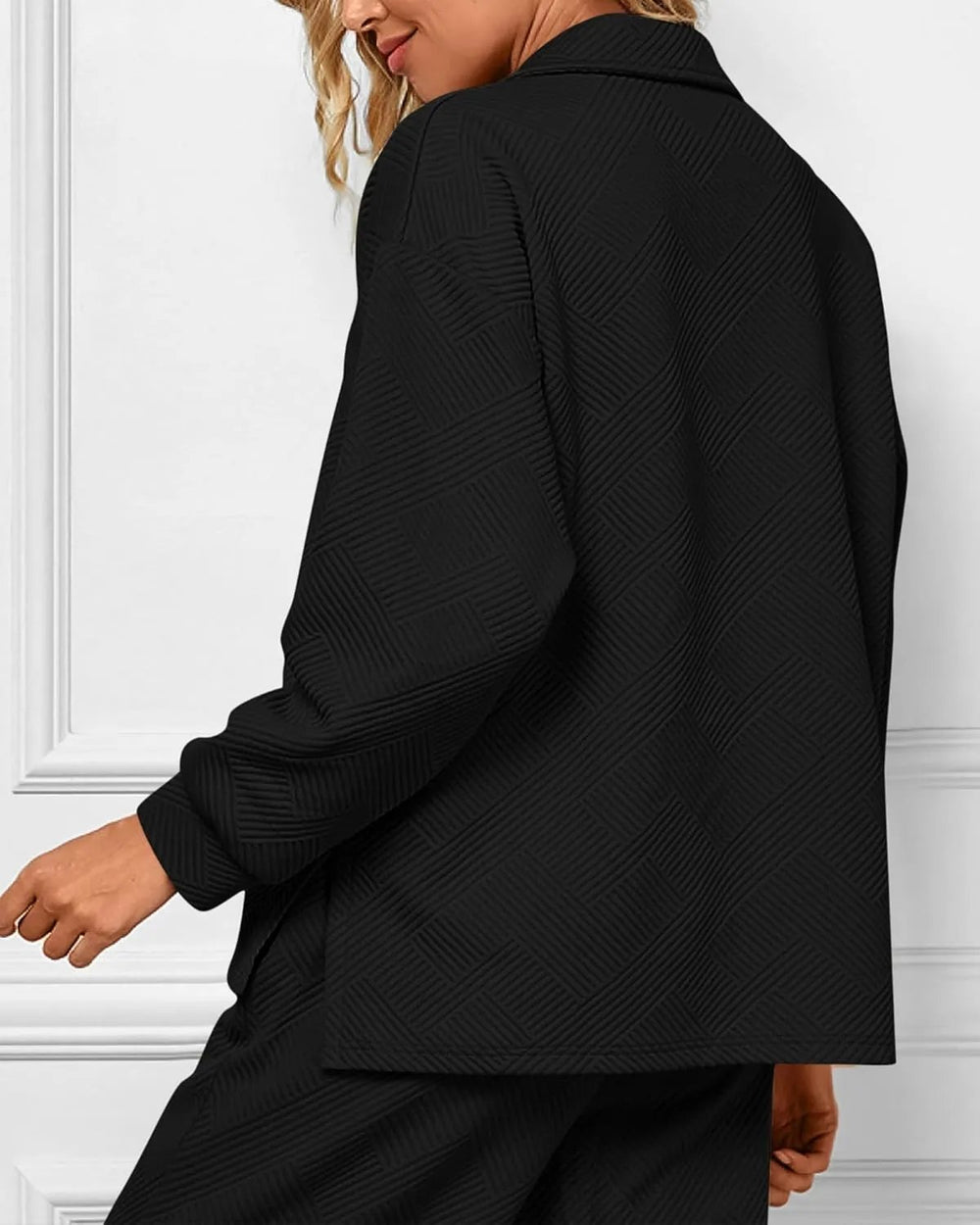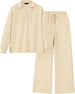 Relax in style with this effortlessly chic lounge set. Featuring a relaxed-fit top with a subtle collar and wide-leg pants, this set brings you comfort without sacrificing style. The textured fabric adds a touch of sophistication, making it perfect for lounging at home or casual outings.