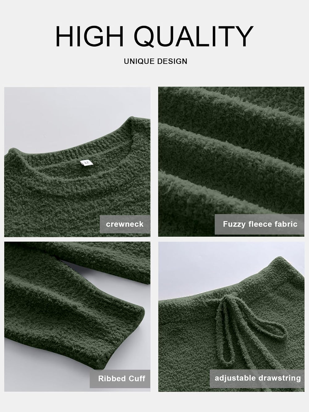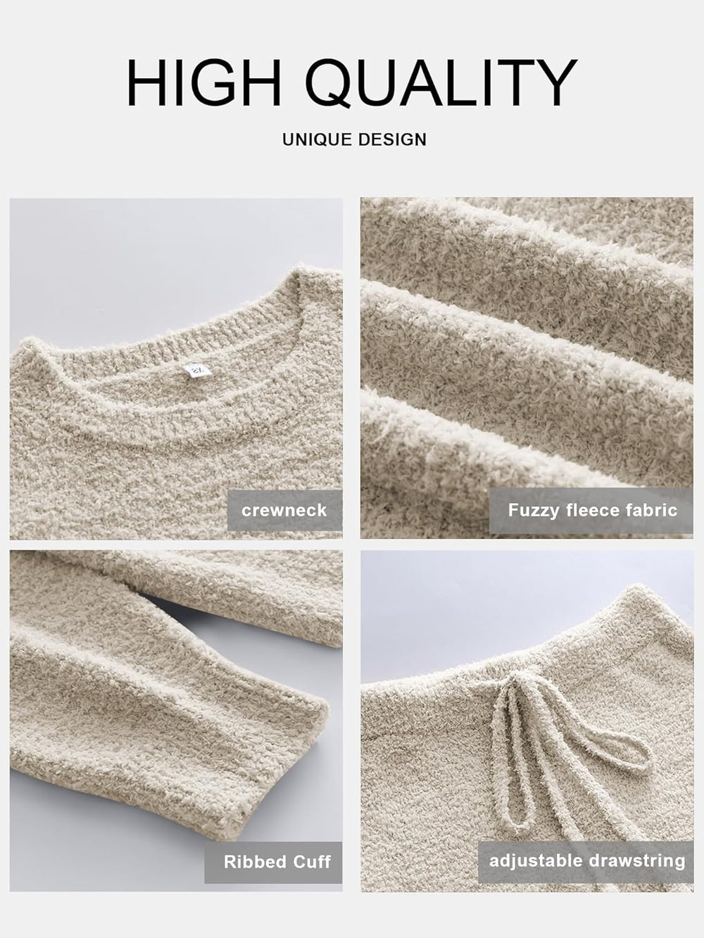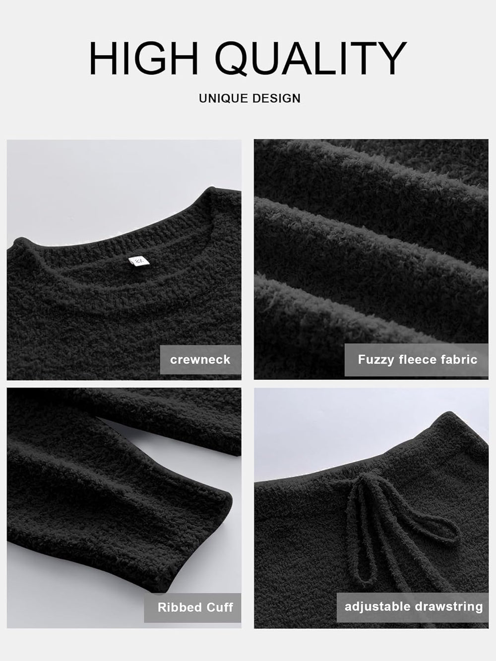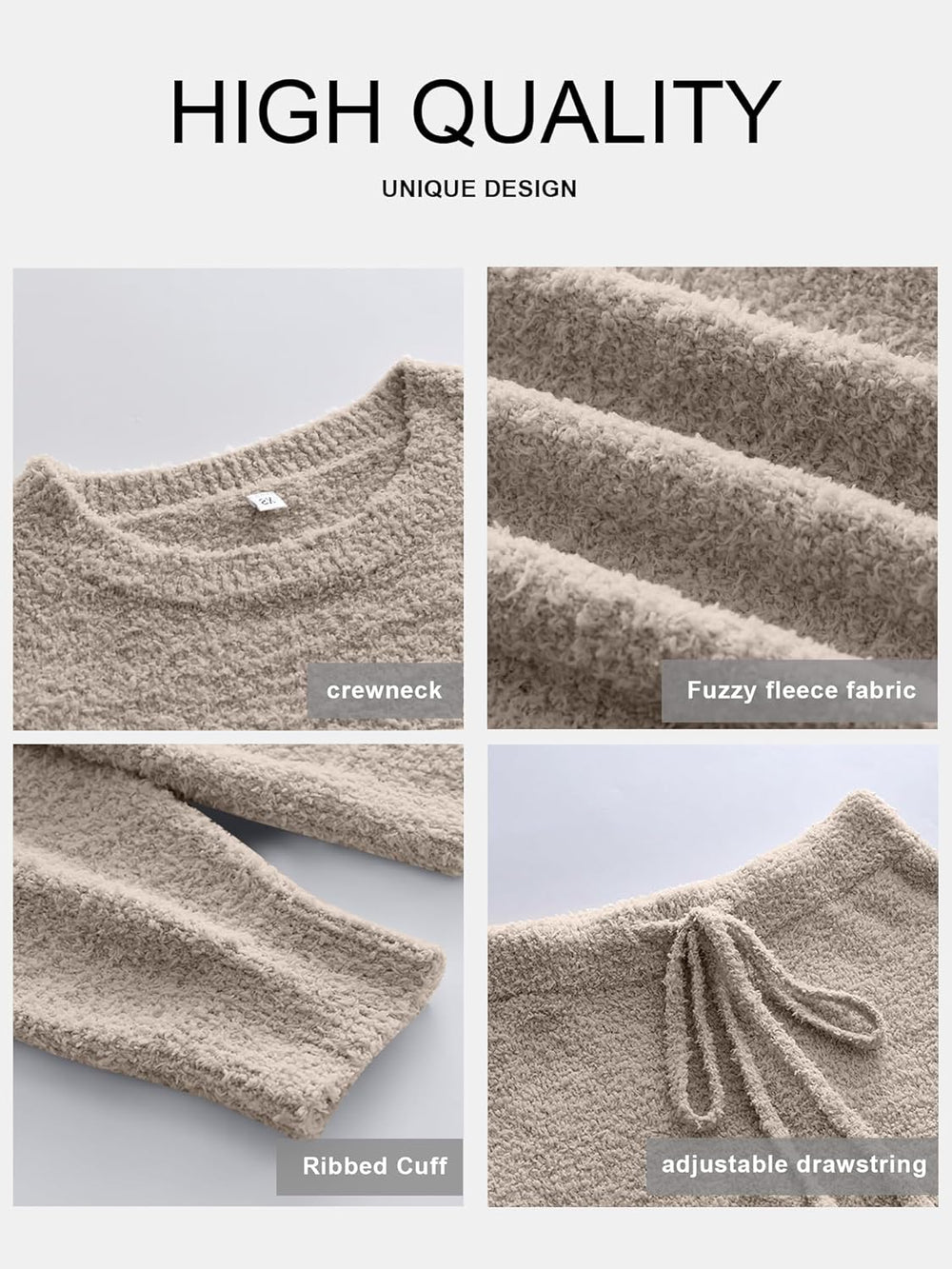 Feature: Fuzzy fleece fabric, long sleeve, crewneck, high waist with adjustable drawstring, elastic waistband, pullover sweater top, and wide-leg pants. This lounge set is suitable for daily, home, pajama party, travel.