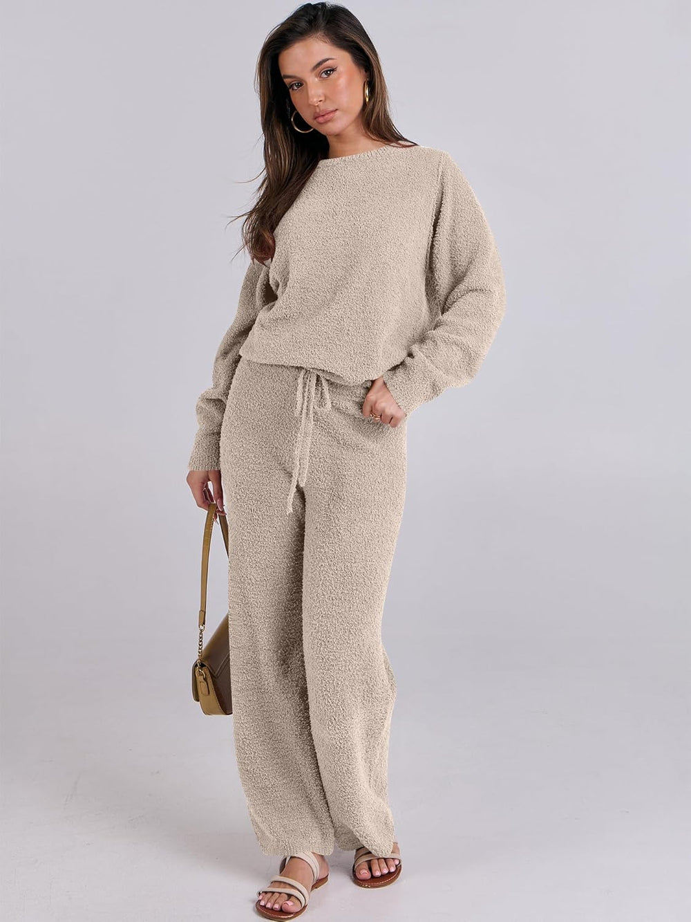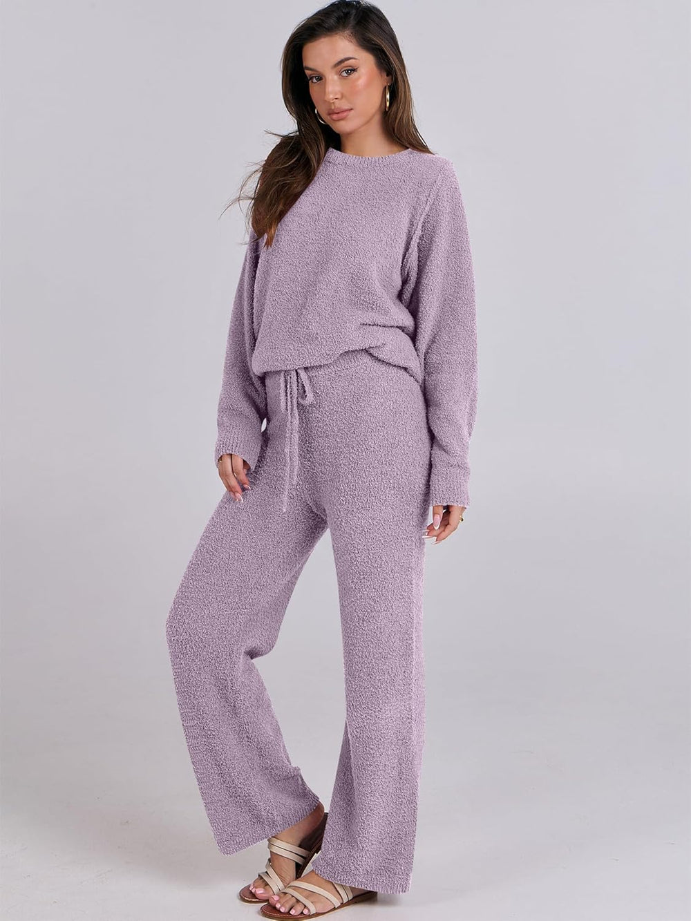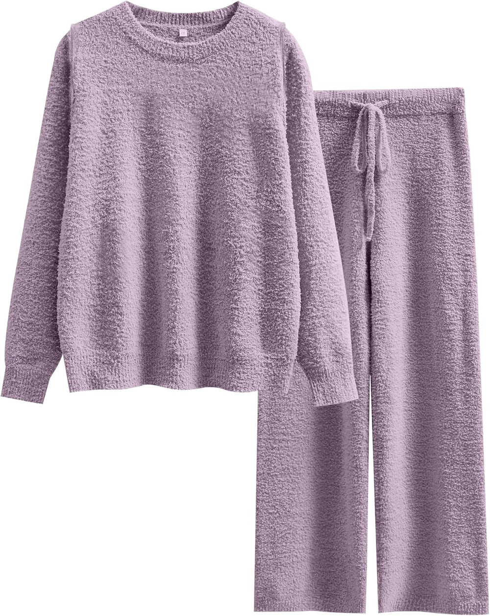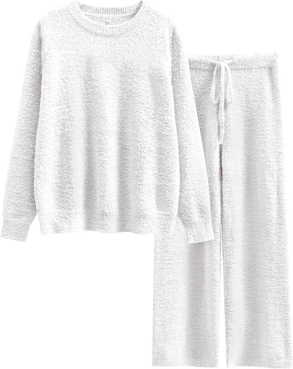 Feature: Fuzzy fleece fabric, long sleeve, crewneck, high waist with adjustable drawstring, elastic waistband, pullover sweater top, and wide-leg pants. This lounge set is suitable for daily, home, pajama party, travel.