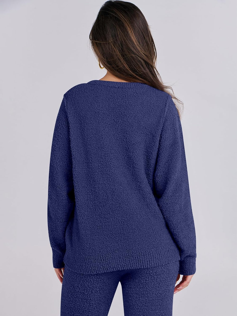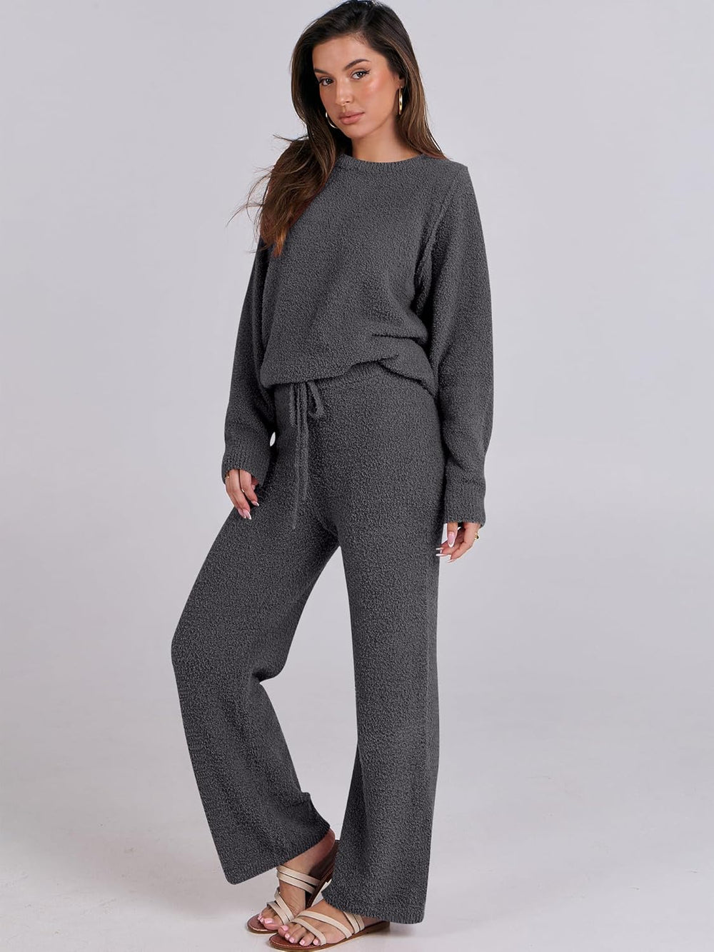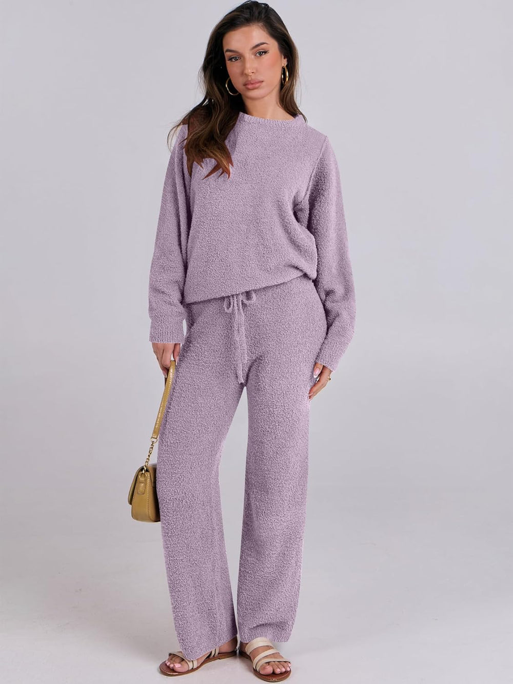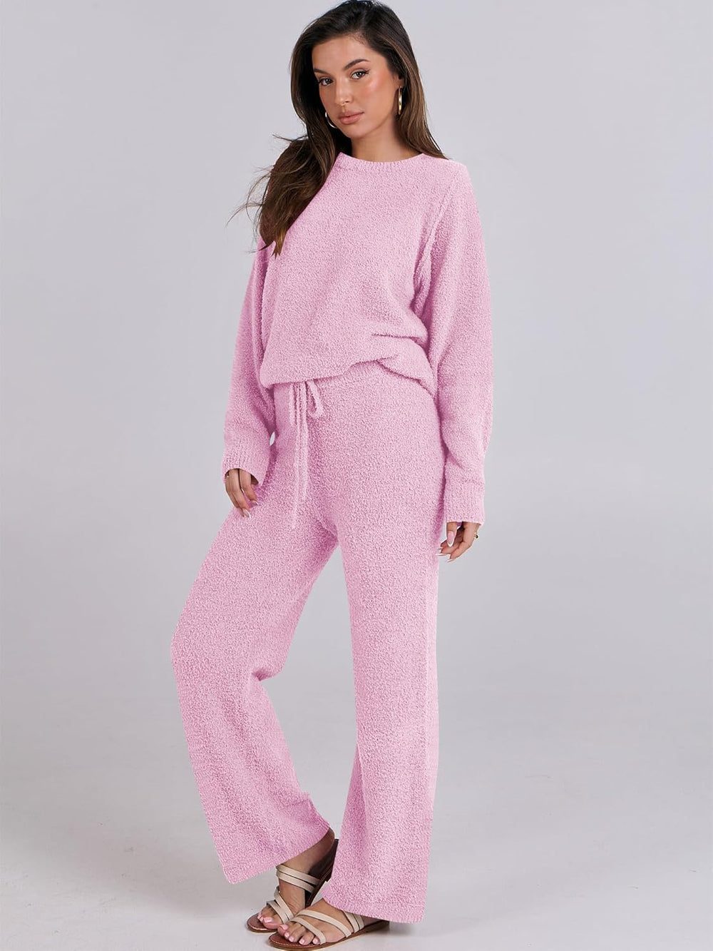 Feature: Fuzzy fleece fabric, long sleeve, crewneck, high waist with adjustable drawstring, elastic waistband, pullover sweater top, and wide-leg pants. This lounge set is suitable for daily, home, pajama party, travel.
